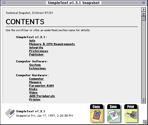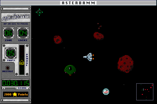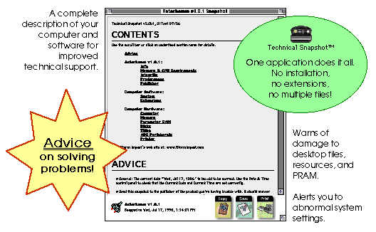 Asterbamm![]() Dogfight in a sea of asteroids and come home a hero! The dark boulders bear down on your ship. You swing away, scream, and fire a few potshots -- promising yourself you'll get them on the next pass. The asteroids can shield you when you need relief from the enemies' blasts, but hug them too closely and your ship becomes nothing more than a tiny tin cavity on their cold, scarred surface. The Asterbamm fleet is our greatest effort to confront an alien enemy that has a stranglehold over the earth's manifest destiny. The asteroid field that approaches the alien's front line appears innocent enough, but with you at the helm of a shadowed space-fighter, they're in for a big surprise! ![]() With stunning 256 color and black & white graphics, easy to use interface, digitized sound, and action that never quits, Asterbamm will entertain you for eons. ![]() Download Asterbamm_v101.zip Version history: Asterbamm-Read-Me.txt Technical Snapshot![]() Dramatically improve technical support! The next time you contact a company for technical support, save yourself a lot of time and frustration by including a snapshot of your entire system. Technical Snapshot is easy to use, whether you're a Macintosh novice or a power user.