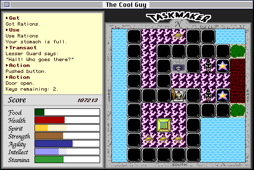 houses do today on the Wii, Playstation, Xbox, and so on. This was a wonderful time in our lives. Thank you to all the kind people that purchased our products and played our games! This page contains some of the original content from the Storm Impact website. There are still some old Mac archive sites that allow you to download our software. However, many sites don't have the most-recently released versions. So, as a public service, this page now includes downloads of the final versions of each product. The software was written during the period of Mac OS 7.0 to 8.1. Theorectically, any computer running or emulating those OS versions should be compatible. Earlier (6.0.x) and later (9.x) Mac OS versions *might* be compatible. Since these programs are shareware, you can experience the nostolgia of many levels of entertainment without a registration number. You can likely find bootleg registration numbers on the Internet, although you need to watch out for some of those types of sites because they try to inject malacious code when you visit them. For a $10 PayPal payment, David will email you registration numbers for all of the products. But, unfortunately, manuals and technical support are unavailable. (But, if enough people buy the registration numbers, I'll try to convert the old manuals from Mac Draw Pro to Adobe Acrobat PDF and then post them online.) Therefore, it is recommended that you first download the programs from this page, install them, and play them for a while to make sure you are happy with them AS-IS. Important: The .zip files listed under each individual program on this page were compressed using ZipIt 1.4 for the Mac. So, if you download the individual files, you'll need to get a copy of ZipIt 1.4 to expand. Instead, right-click and download this '.dsk' disk image that contains all of the programs together. The dsk is compressed using the built-in Windows function, and therefore is uncompressible using a wide variety of programs. The dsk is tested on Basilisk II and HFVExplorer. TaskMaker![]() TaskMaker is an exciting sword and sorcery game where you battle vile monsters and complete tasks under the watchful eye of the TaskMaker. Both beginning and experienced players enjoy exploring over one-hundred million pixels of dungeons and villages. ![]() The program begins with an extensive, interactive, graphic tutorial, which teaches all the basics of the game. Will you escape the clutches of evil by land, sea, or magic? Can you grow to be leader of the land? And in case of an untimely demise -- never fear! You can fight your way out of Hell (a randomly generated maze with four possible exits) to restore your player to life. ![]() New features include:
